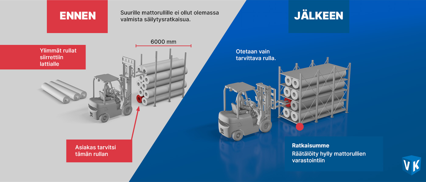 Schenker Oy rakennutti uuden terminaalin Lietoon. Pääsimme suunnittelemaan ja toteuttamaan terminaalin kalustuksen, johon sisältyi kuormalavahyllyjä, pientavarahyllyjä ja ulokehyllyjä. Lisäksi kalustukseen tuli hieman erikoisempaa, kuvassa näkyvää pitkien mattorullien varastointiin tarkoitettua hyllyä sekä ulkona oleva lumenpudotusteline.